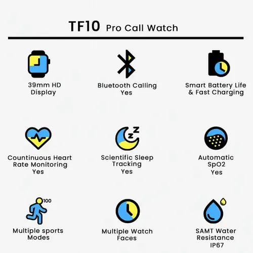 Designed for your daily lifestyle, the TF10 Pro lets you make Bluetooth calls, track your heart rate, monitor stress and SpO₂, and enjoy 100+ sports modes — all from your wrist.